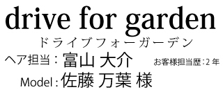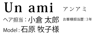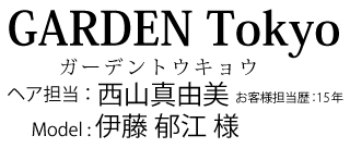 Q1.ヘアスタイルのオーダー内容は?くせ毛を生かしたスタイルで、おしゃれっぽさを出したいのでショートバングに。髪のまとまりやすさが欲しい。 Q2.伊藤様からのリクエストで意識した点はなんですか?実は少し白髪を気にされているので、カラーはハイライト+マニキュアで、若々しさとおしゃれさを出しました。根本からスライドカットで毛量をおさえることと、ショートバングにする事で、遊びながら広がるくせ毛をおしゃれな雰囲気になりようにしました。髪がパサつかないようにカラーではなくマニキュアにして、ご自身でも髪がまとまりやすいようにしました。 Q3.お客様の人柄や、ステキな部分は何ですが?伊藤様はやさしくてセンスが良くてお話しているとほんわかしてくる人柄。大学生→社会人→結婚とずっと伊藤様を見てきたので、本当に友達とか妹みたいな存在です。 | |||||