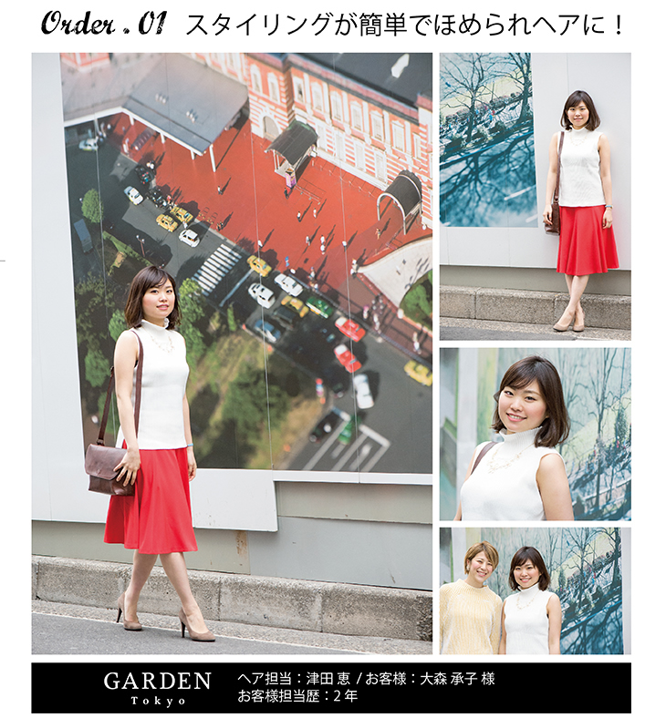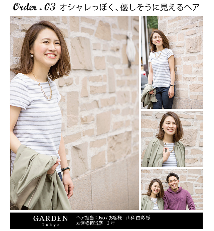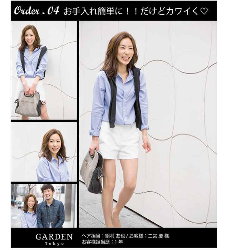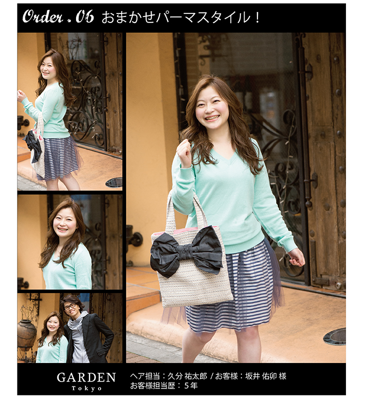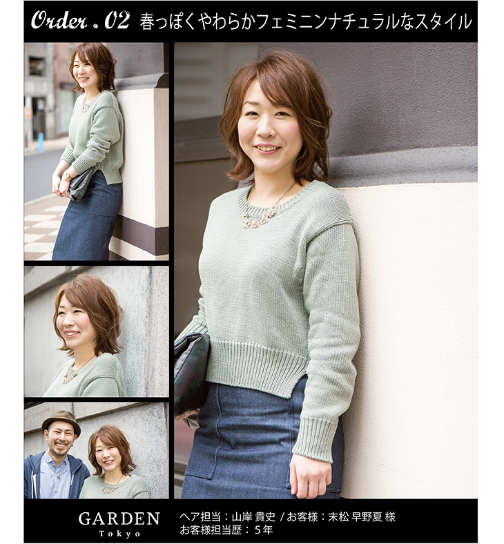 長さを肩ぐらいまで、ペタッとしてしまうのでふんわりと。やわらかくてフェミニンナチュラルなスタイルで。春を少し意識した感じで、と。でも、いつも「おまかせっ」て言われます。 |