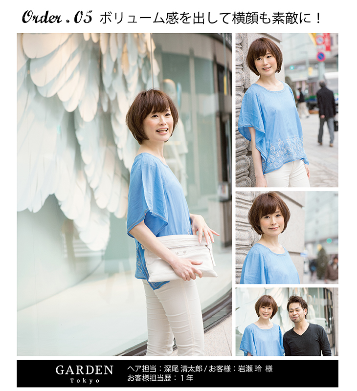 ショートが少しのびてボリュームが下に降りてきたので上にボリューム感を出したい。正面だけじゃなく横顔もよく見えるようにしたい。 |
